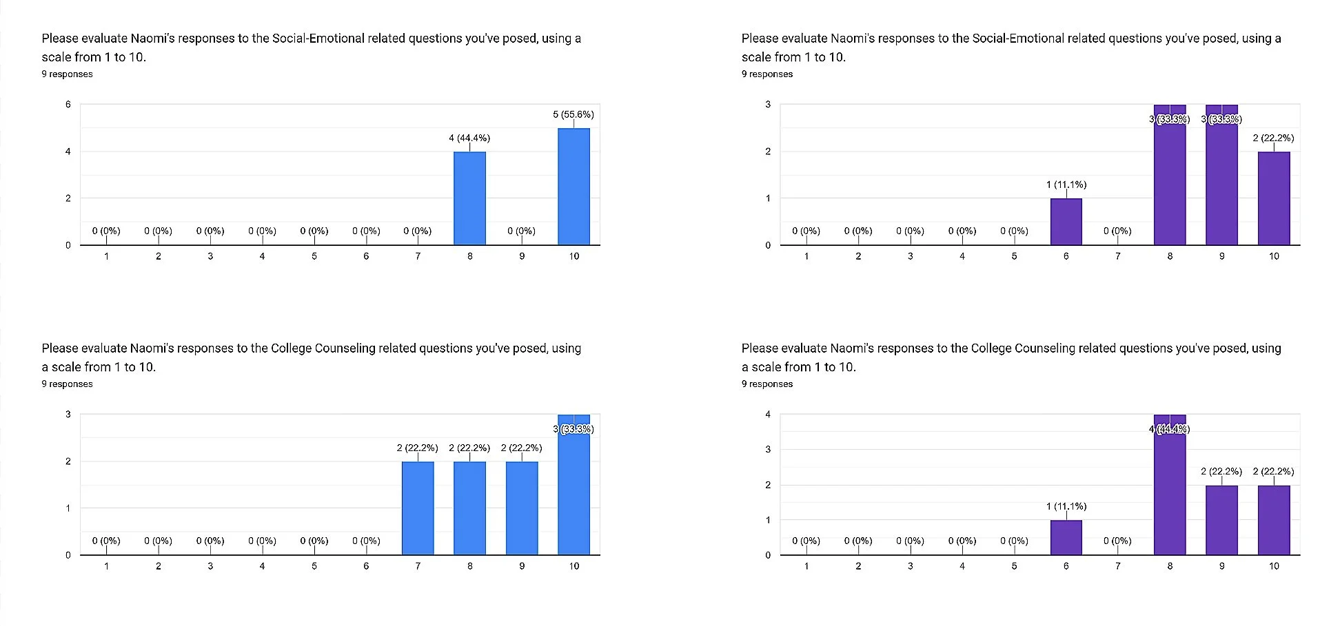 Metrics: The metrics above display how the high school participants scored Naomi on a scale from 1 to 10 for Social-Emotional, College Counseling, and Career Planning questions. The blue charts display the data gathered in the initial survey, where students utilized Naomi without prior AI training. In contrast, the purple charts illustrate the findings of the subsequent survey conducted at the week's conclusion following AI training.